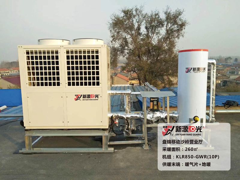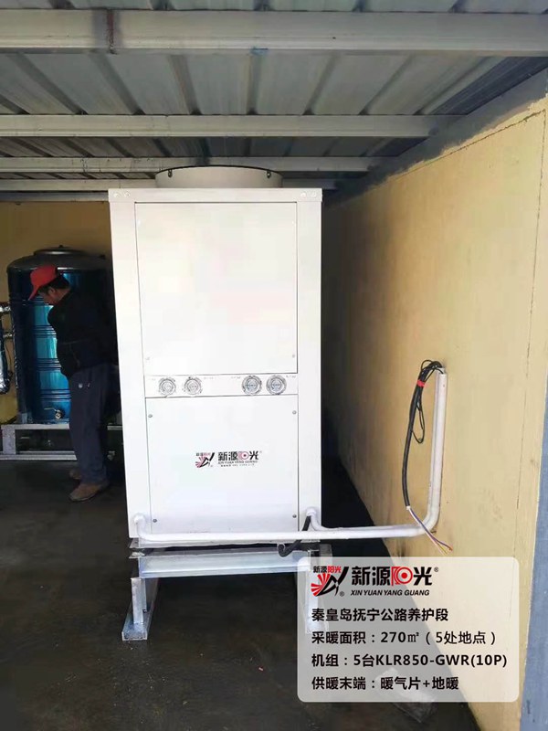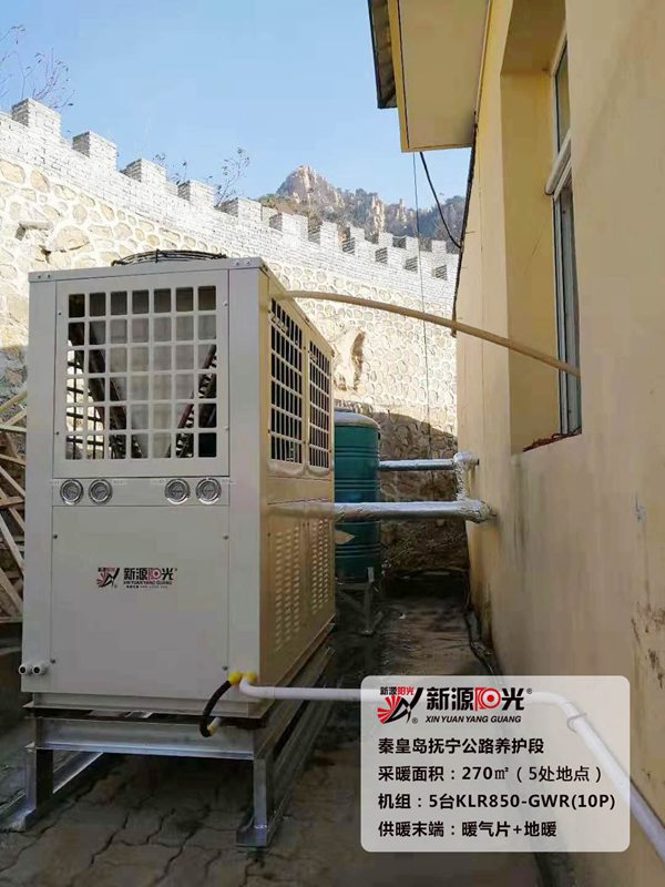 供暖面積:270㎡(五處地點,每處270㎡)         機(jī)組:新源陽光10P空氣能熱泵機(jī)組         采暖末端:地暖+新型暖氣片