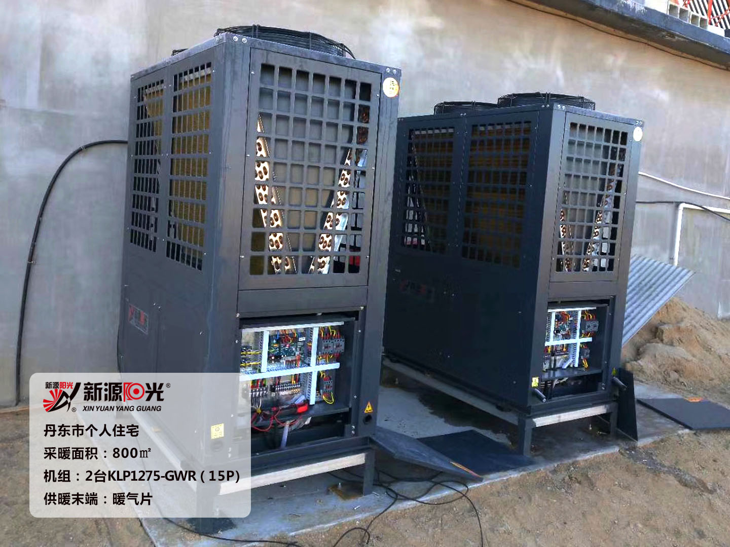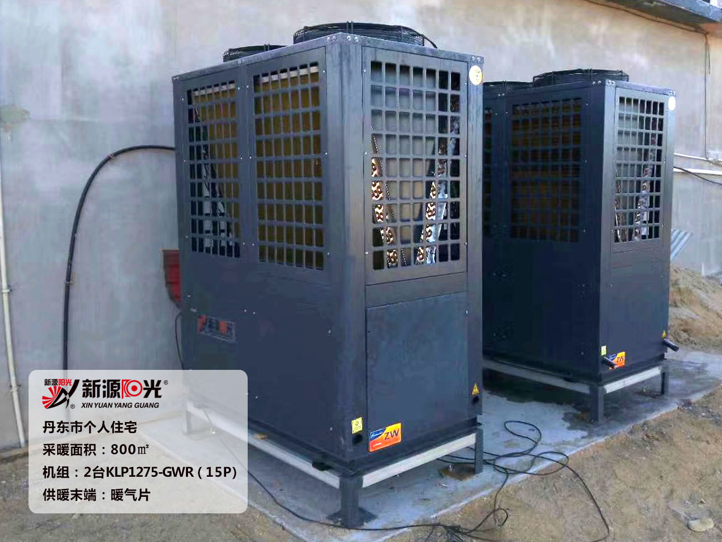 供暖面積:2000㎡         機(jī)組:新源陽光25P空氣能熱泵機(jī)組         采暖末端:暖氣片